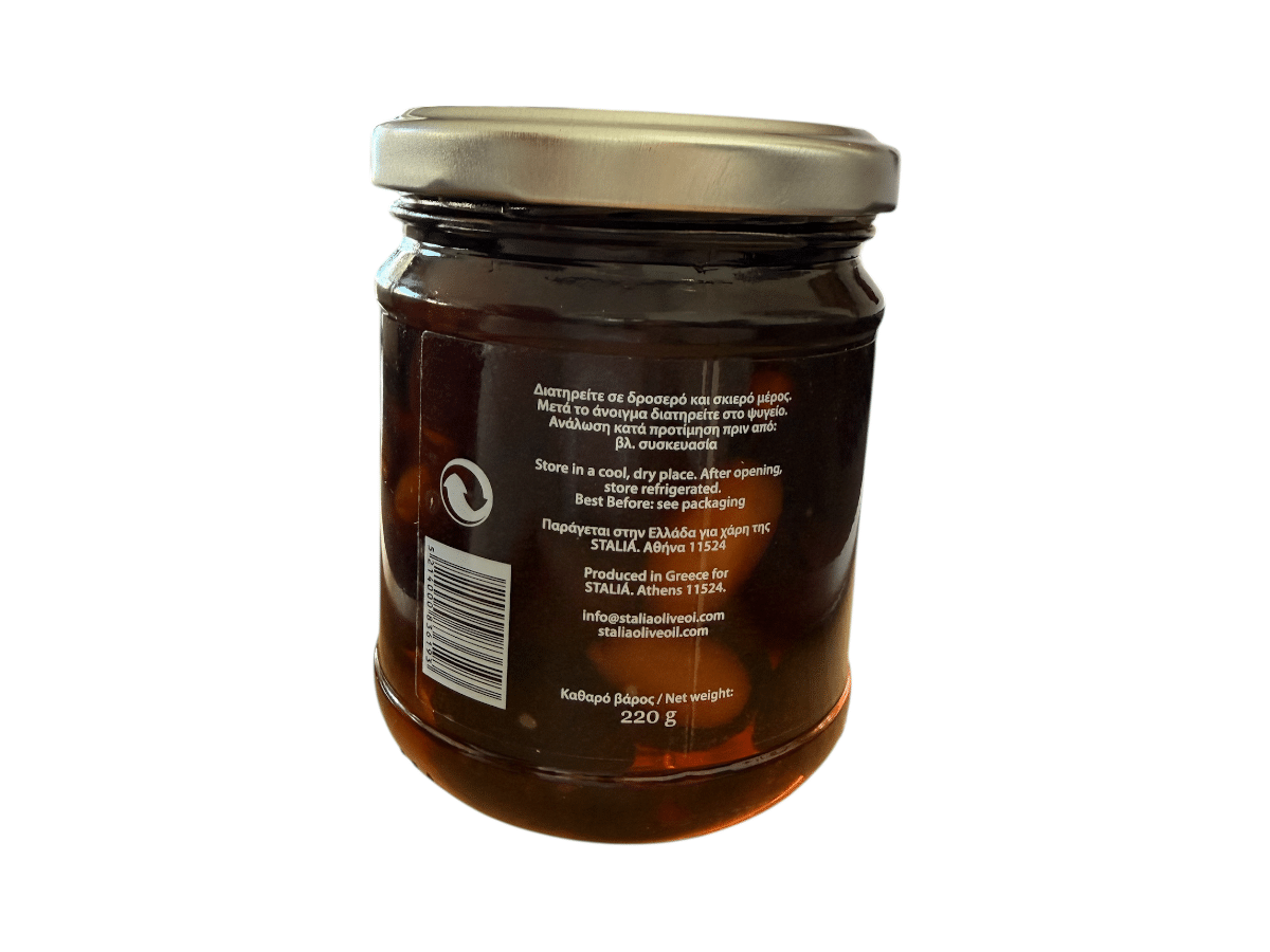 Les olives Kalamata confites et sucrées offrent une autre manière de découvrir cette variété d’olive emblématique. Ici, la préparation sucrée adoucit le fruit. Ainsi, l’olive conserve son caractère tout en développant une texture fondante et une saveur équilibrée.