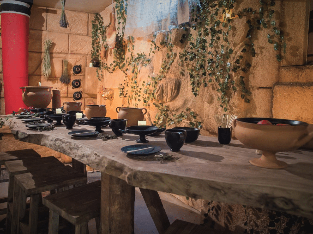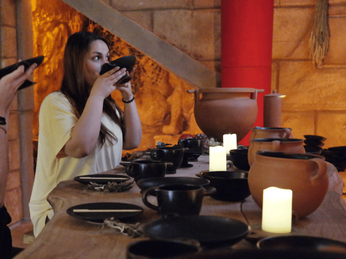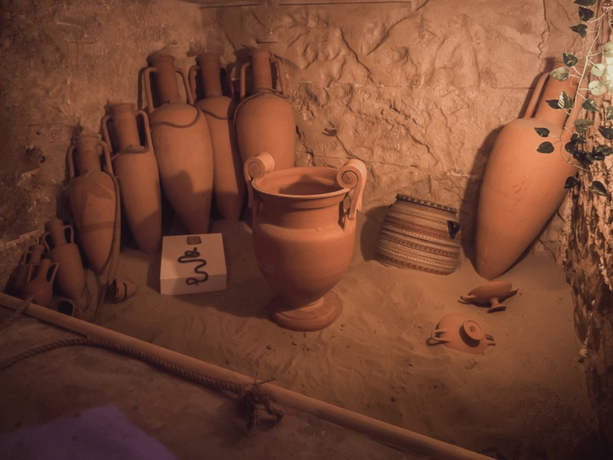 Salle des vignerons inclut une dégustation de vin grec servi dans un kylix, des en-cas antiques et une présentation interactive des techniques de vinification anciennes.