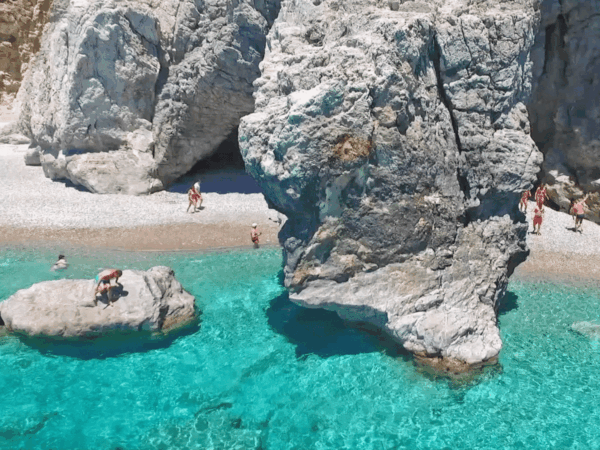 You continue your cruise to the famous Anthony Quinn Bay, a site of particular charm. Surrounded by pine trees and craggy rocks, it offers a striking natural backdrop.