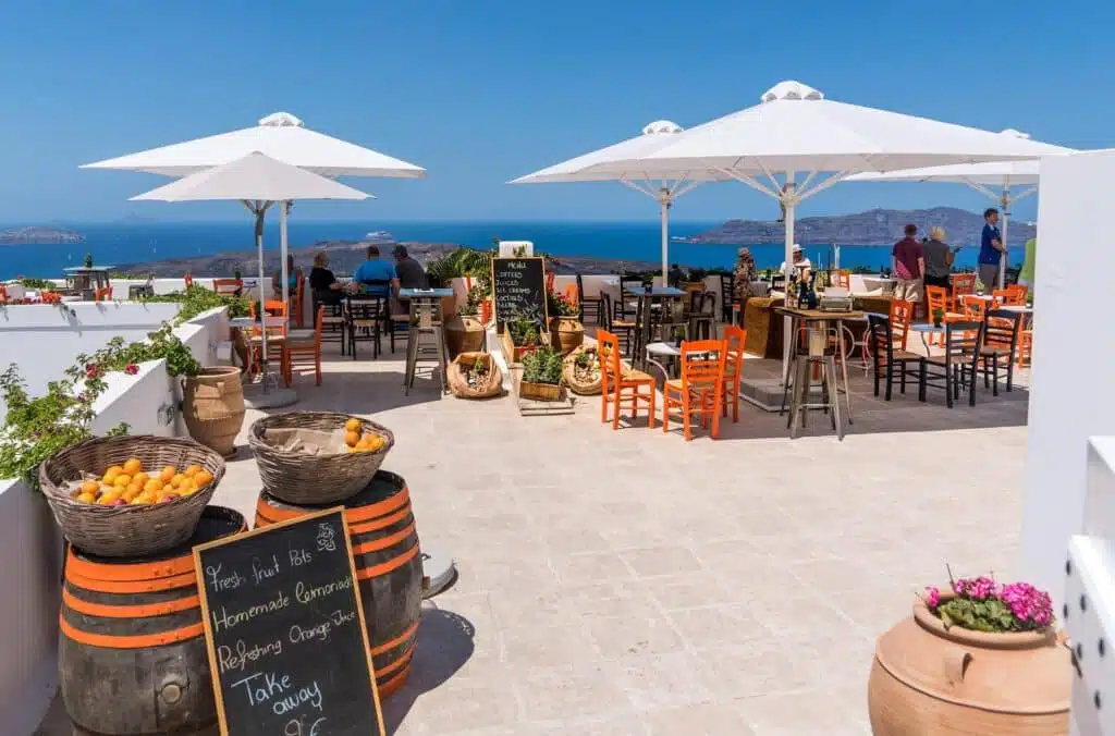 Terrasse de taverne traditionnelle à Santorin avec vue panoramique sur la caldeira